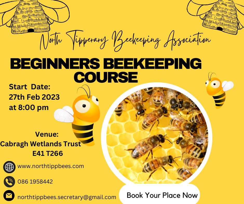 A beginners course in beekeeping will be held at the Community Cabra Wetlands Centre, Holycross, Thurles, E41 T266 commencing February 27th 2023